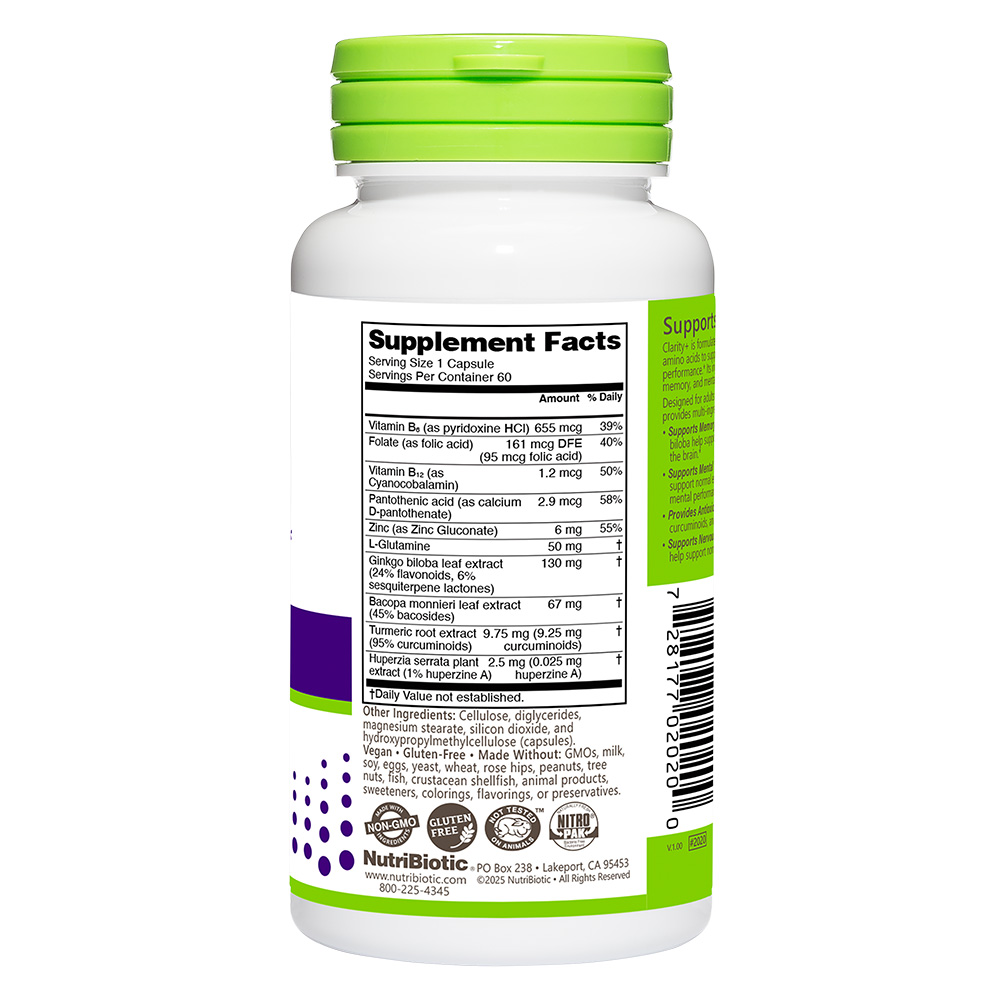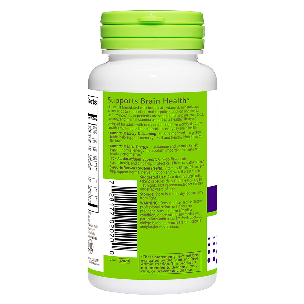 Clarity+ is formulated with botanicals, vitamins, minerals, and amino acids to support normal cognitive function and mental performance.* Its ingredients are selected to help maintain focus, memory, and mental stamina as part of a healthy lifestyle.* Designed for adults with demanding cognitive workloads, Clarity+ provides multi-ingredient support for everyday brain health: